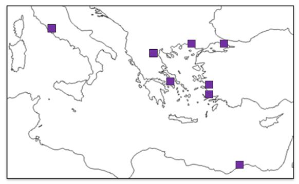 Link the biographical data to the names of eight outstanding women of classical antiquity, make a brief commentary on Agnodice, an important Greek physician of the 4th century BC, and locate on a blank map the places where they were born and where they carried out their activities. They were: Aglaonice, Agnodice, Aspasia, Hipparchia, Hypatia, Metrodora, Theodora and Timarete.