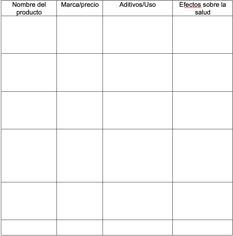 2. Fíjate en la etiqueta de esos productos y rellena la tabla siguiente (añade celdas si lo necesitas) con todos los aditivos que has anotado. Indica de qué tipo de aditivo se trata, (por ejemplo, ácido cítrico o E-405), para qué se usa (si es un conservante, colorante, antioxidante, gelificante, etc.) y sus posibles efectos sobre la salud.