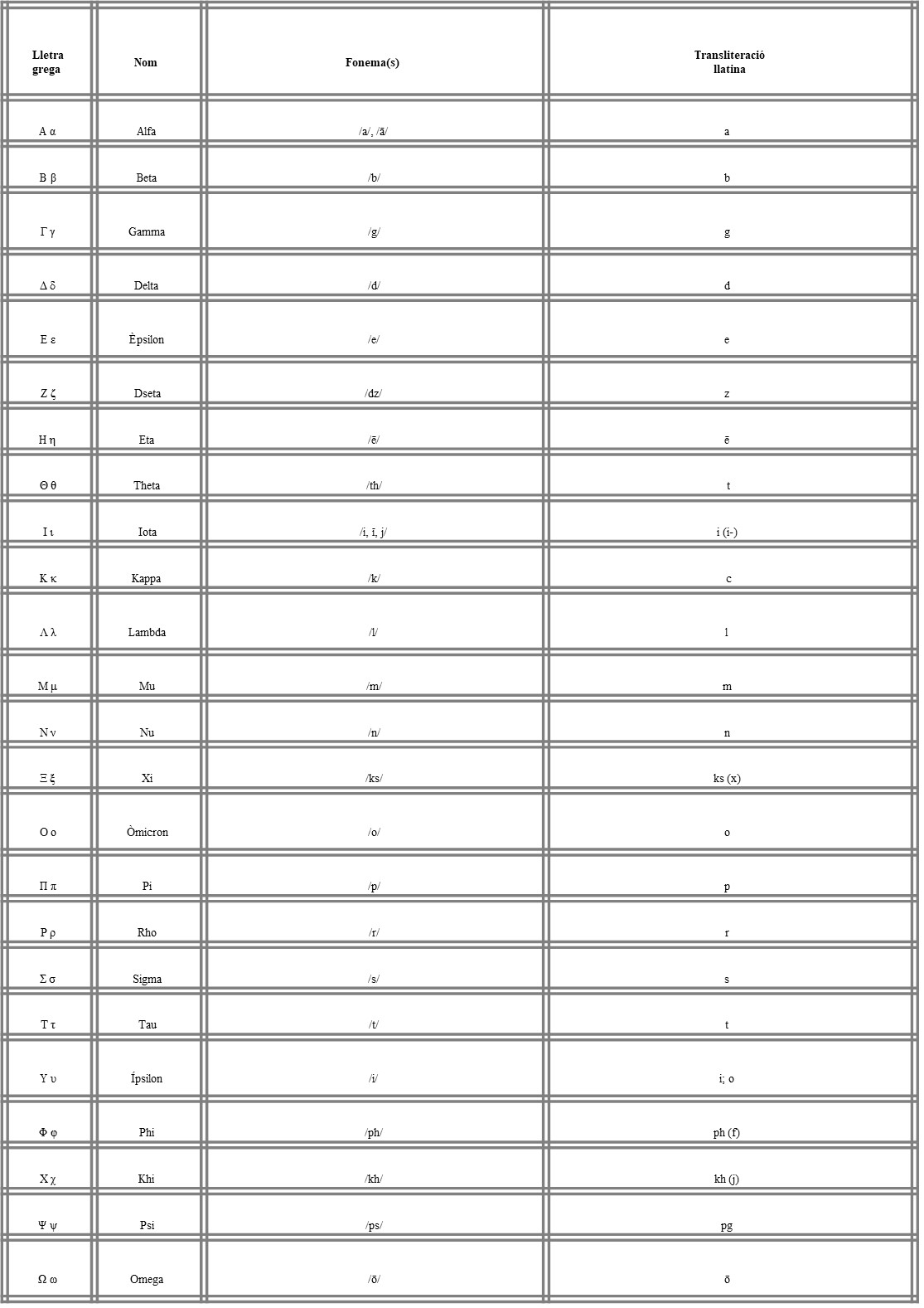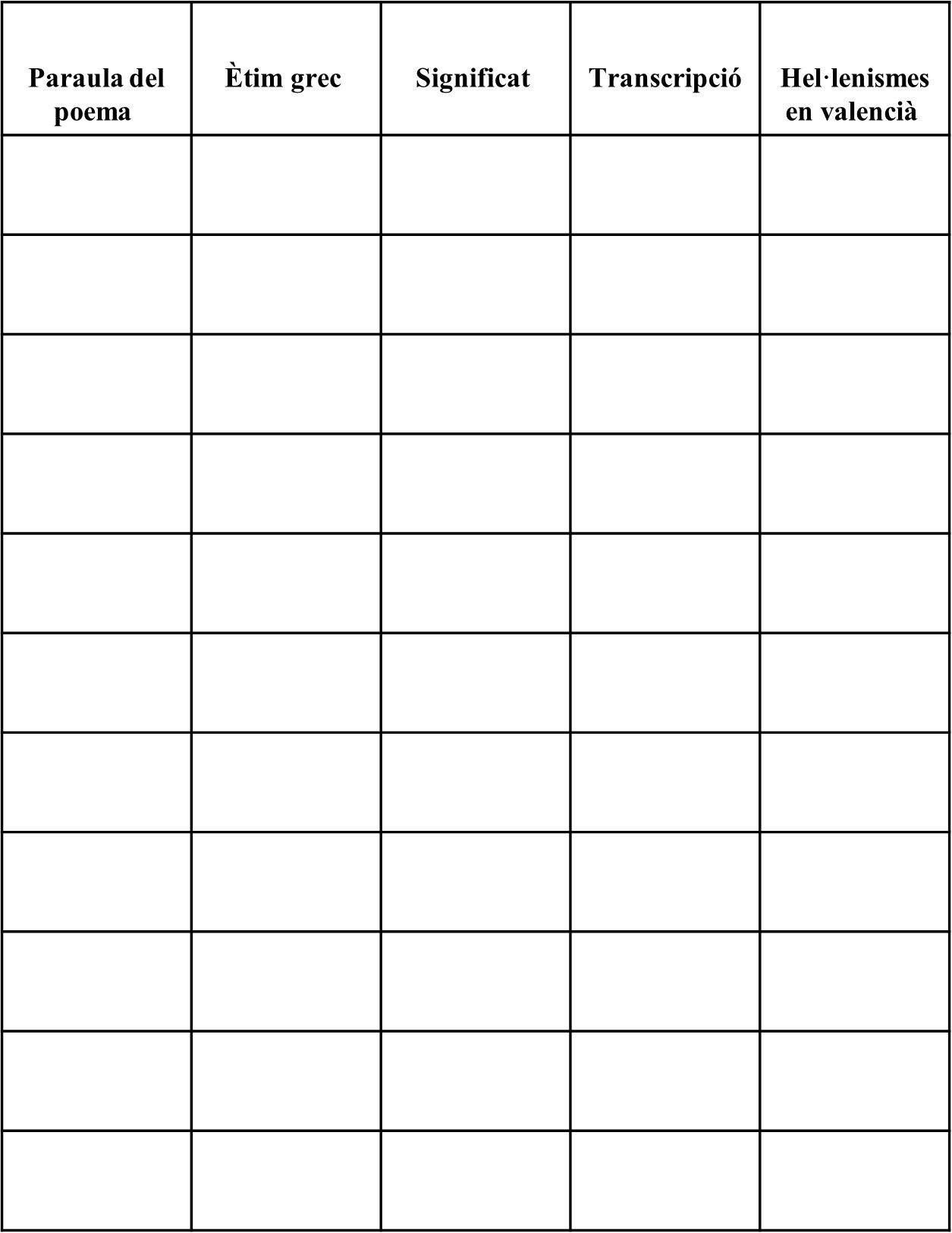 3. Usant la taula que has utilitzat per a llegir els versos, transcriu a l’alfabet llatí els ètims grecs i completa la quarta columna.