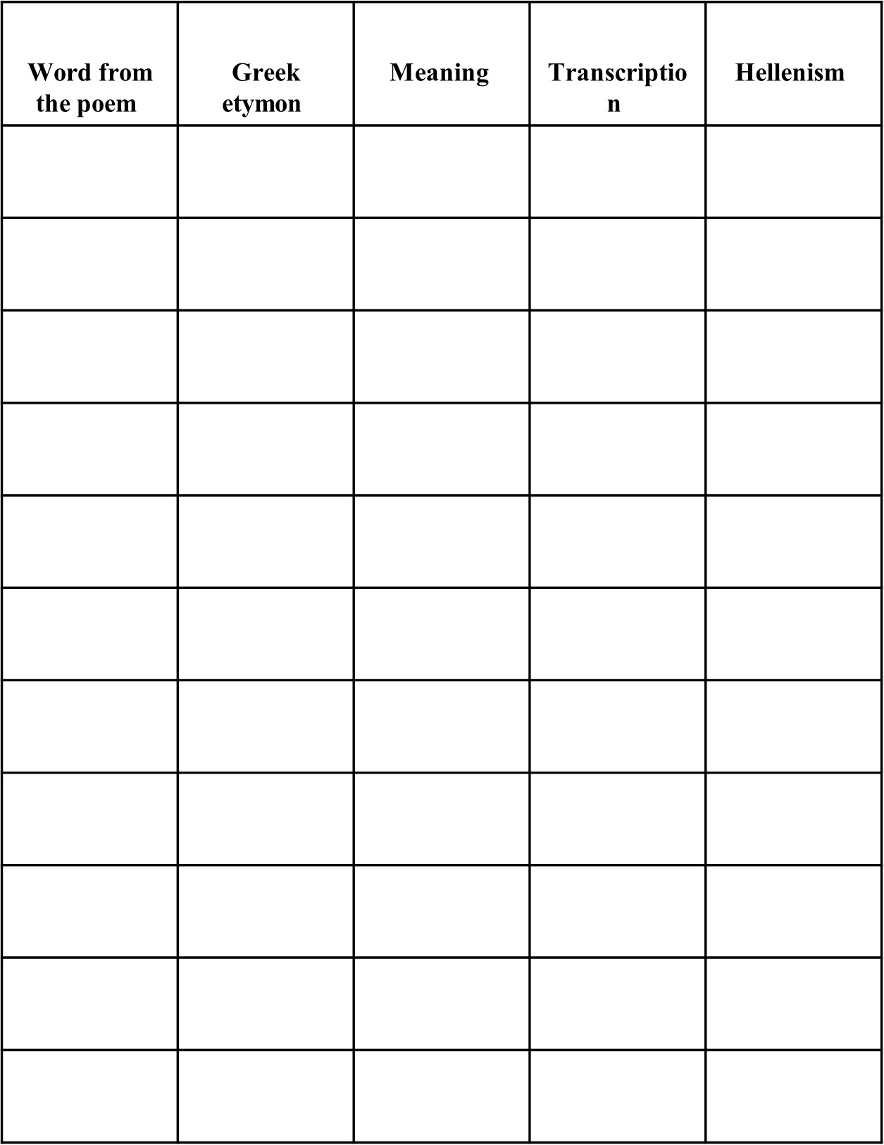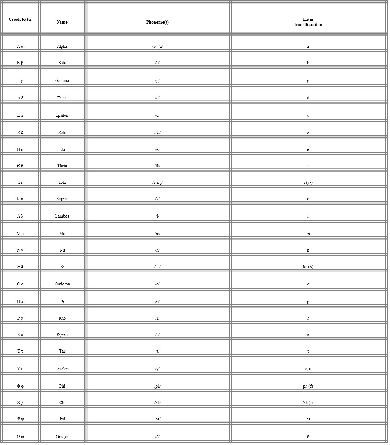 3. Using the table you have used to read the verses, transcribe the Greek etymons into the Latin alphabet and complete the fourth column.