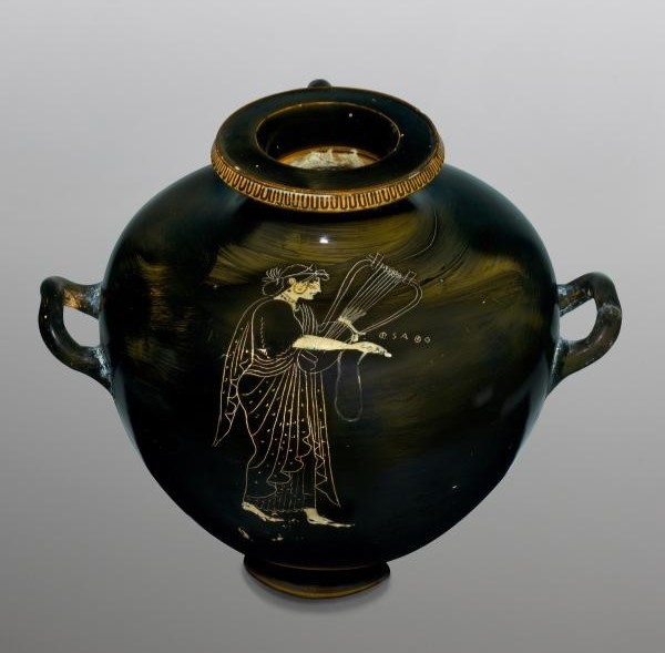 d) Pots observar la tècnica de figures roges en una hídria dels anys 440-430 a. C. conservada en el Museu Arqueològic d'Atenes, en la qual també apareix Safo. Cerca la peça en Internet i descriu com és representada la poeta.