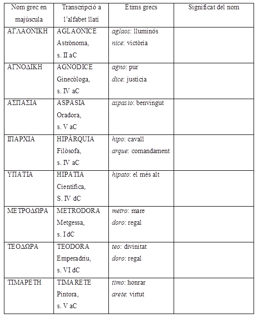 1. Llig el nom de cada dona, la seua activitat i ubicació temporal. A continuació, fixa’t en la semblança amb els noms originals en grec. Finalment, observa els ètims que formen cada nom i dedueix-ne el significat.