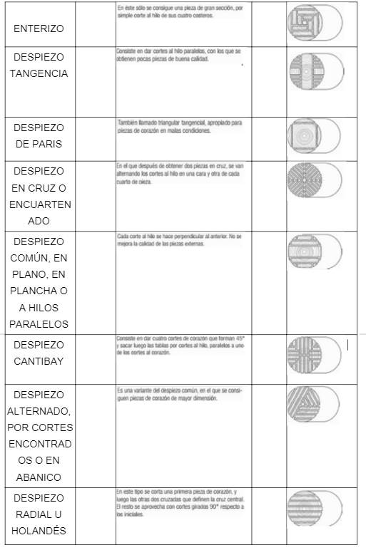 a) Relaciona con flechas el nombre las distintas formas de obtener tablas y tablones a partir de un tronco, con el fin de aprovechar al máximo su madera, y atendiendo a las características del mismo: