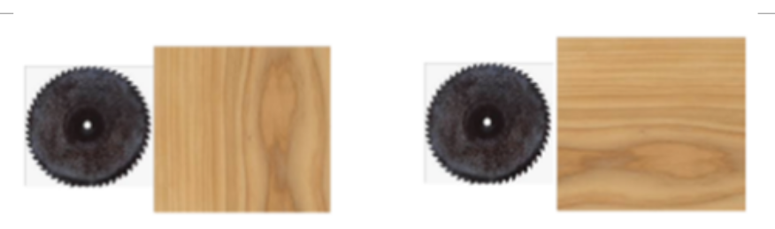 d) Queremos cortar con una sierra circular un trozo de madera. ¿Cómo debemos colocar la pieza de madera para que ésta se astille menos, como la figura de la izquierda o como la figura de la derecha? Justifica la respuesta.