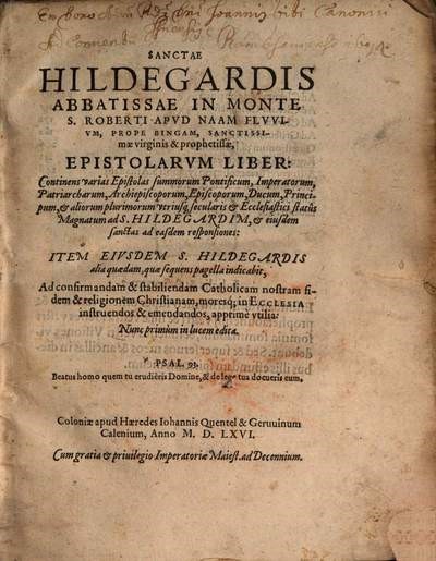 Sanctae Hildegardis Abbatissae In Monte S. Roberti Apvd Naam Flvvivm, Prope Bingam, sanctissimae virginis & prophetissae, Epistolarvm Liber: Continens varias Epistolas summorum Pontificum, Imperatorum, Patriarcharum, Archiepiscoporum, Episcoporum, Ducum, Principum, & aliorum plurimorum utriusq[ue] secularis & Ecclesiastici status Magnatum ad S. Hildegardim, et eiusdem sanctas ad easdem responsiones; Item Eivsdem S. Hildegardis alia quaedam ...