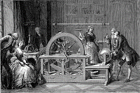2. En el siglo XVIII, las Academias y los Salones europeos, buena parte de ellos regentados por mujeres, desarrollaron multitud de experimentos con electricidad estática, como puede verse en la siguiente imagen.