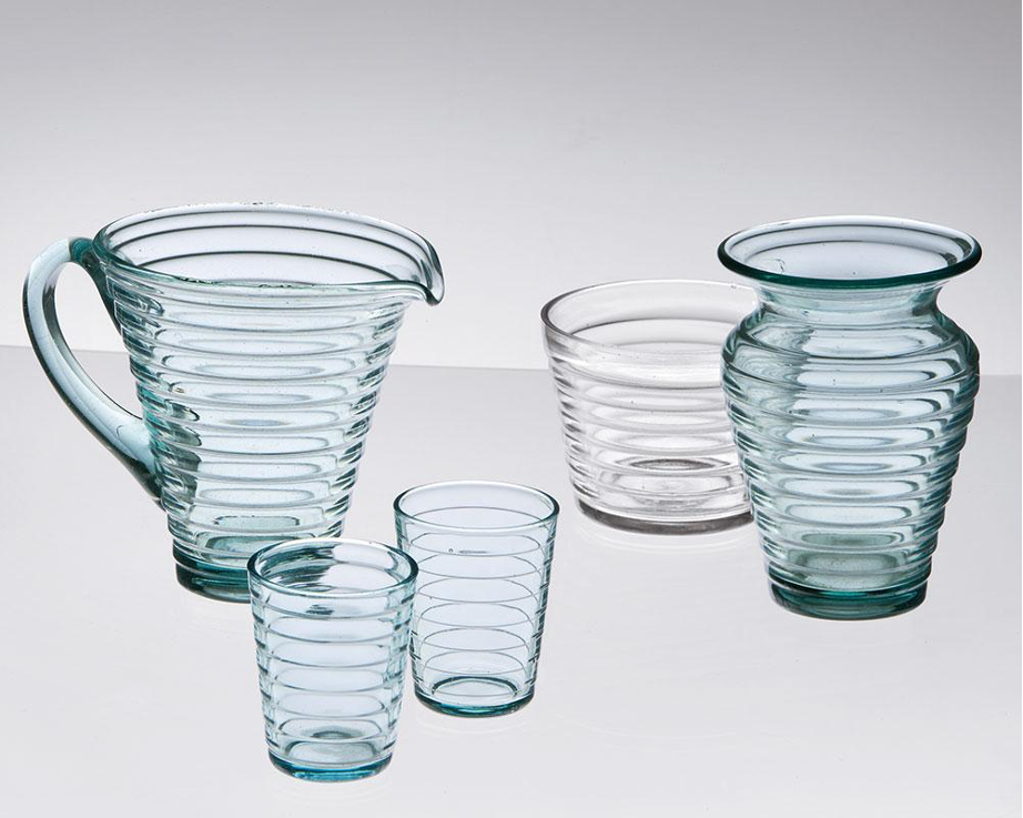 A. Aquí tienes una foto con varias piezas de la serie de cristal Bölgeblick de Aino Aalto esta seria constaba de muchas más piezas, busca en internet imágenes de la serie de cristal Bölgeblick de Aino Aalto. Prueba buscando en google imágenes con la palabra Bölgeblick. Lee la siguiente información al respecto para comprender cómo y por qué fue diseñada por una mujer arquitecta.