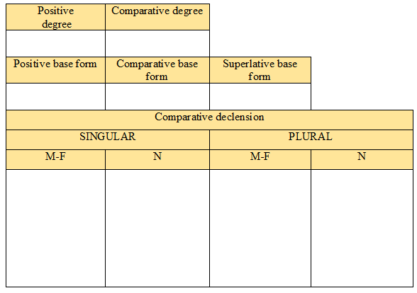 1.- Find in the text the adjective in the positive and comparative degree, give the base form of its three degrees of comparison and decline it in the comparative degree.