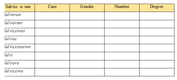 2.- Analyse the morphology of the following forms of salvus, -a, -um: