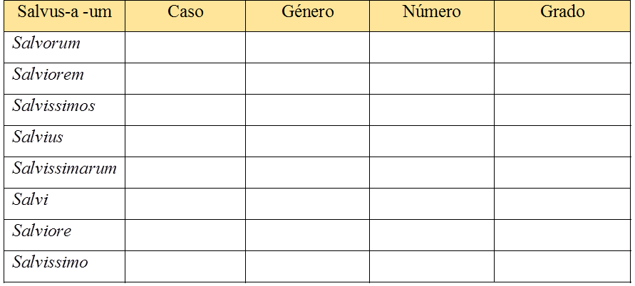 2. – Analiza morfológicamente las siguientes formas del adjetivo salvus,-a, -um: