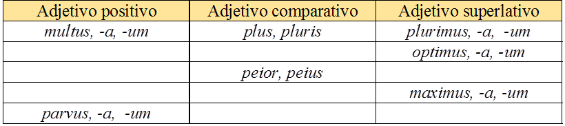 3.- Recuerda que hay adjetivos irregulares (mucho, bueno, malo, grande, pequeño) que se forman de tema distinto al adjetivo en grado positivo. Completa la siguiente tabla: