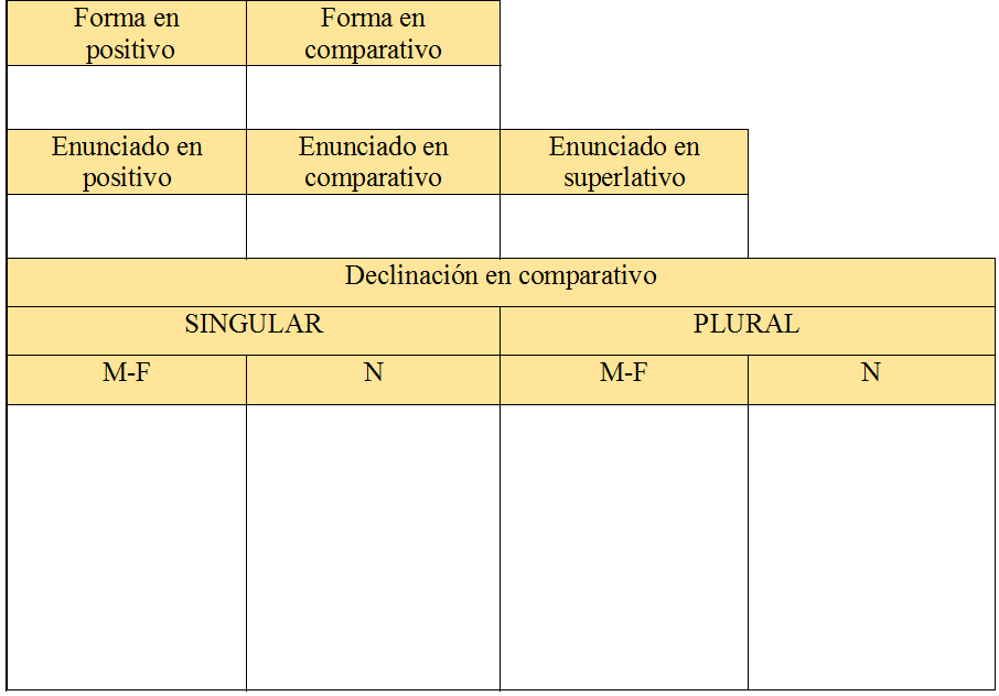 1.- Localiza el adjetivo que aparece en grado positivo y comparativo, enúncialo en sus tres grados de comparación y declínalo en comparativo