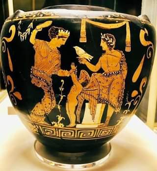 1- La cerámica es una de las más ricas fuentes de información sobre múltiples aspectos de la vida pública y privada de la antigua Grecia. En este vaso del 360 a. C., procedente del museo arqueológico nacional de Tarento (Italia), tenemos a Afrodita amenazando y a punto de golpear a su hijo Eros.