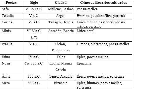 Las autoras que se nombran vivieron entre los siglos VII y III a.C. y ninguna de ellas fue ateniense, sino que provenían de regiones tan distantes como Bizancio, en la antigua jonia, o Locria, en la Magna Grecia: