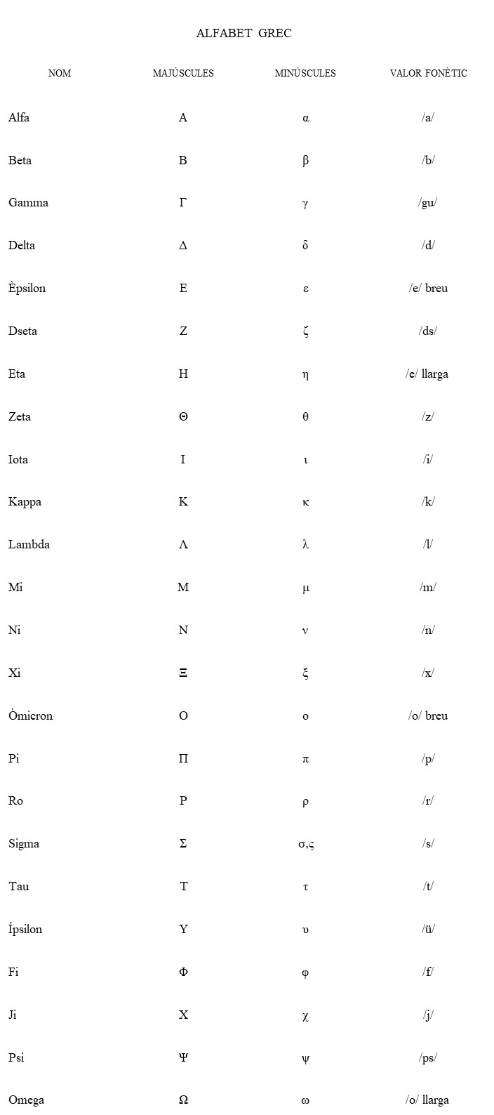 -Cada membre de cada grup tindrà una taula amb l’alfabet grec i la seua pronunciació.
