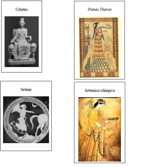 Ara que ja coneixes els atributs de Cíbele, la Potnia Theron, Artemisa efèsia i Artemisa Olímpica, identifica-les en les imatges següents.