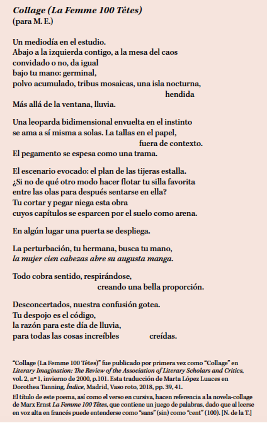Lee el siguiente poema de Doretea Tanning: poema Collage (La Femme 100 Têtes). Lo encontrarás en Coxon, Ann, Mahon, Alyce , Murga Castro, Idoia, y Tanning, Dorothea (2018). Detrás de la puerta, invisible, otra Puerta. Alyce Mahon y el departamento de Actividades Editoriales del MNCARS, p. 98, (11-04-2022), <https://www.museoreinasofia.es/sites/default/files/publicaciones/catalogosPDF/11_dorothea_tanning._castellano.mncars.imprenta.pdf>. Posteriomente, realiza las actividades propuestas.
