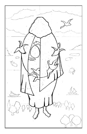 2- Una vez realizado este dibujo que representa la figura principal y el fondo, aplica el color utilizando lápices de colores y rotuladores. Puedes crear texturas para un resultado más expresivo.