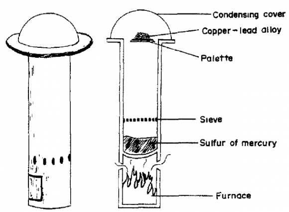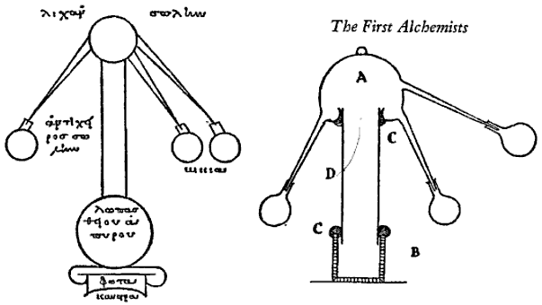 1. Observa el dibujo de la reconstrucción de los alambiques de María de Alejandría (s. II?), identifica sus partes y compáralos con el aparato de destilación que hay en el laboratorio de tu centro.