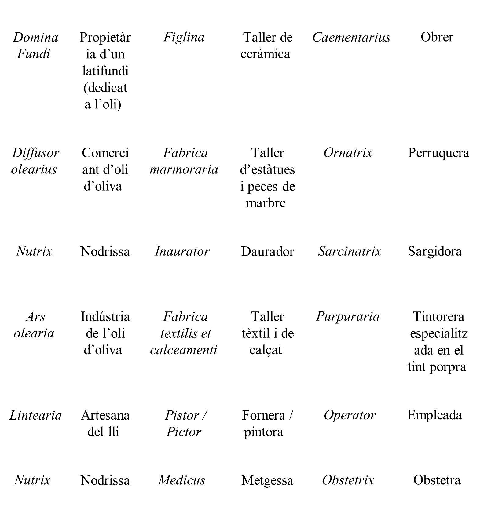 Trobem també altres professions: caementarius (obrer): Iulia (Conimbriga, Coimbra); purpuraria (manufactura de la porpra): Baebia Veneria (Gades); lintearia (teixidora o comerciant de lli): Fulvia (Tarraco); pictor o pistor (pintora o fornera): Caecilia M […] (Maresme, Barcino), etc.