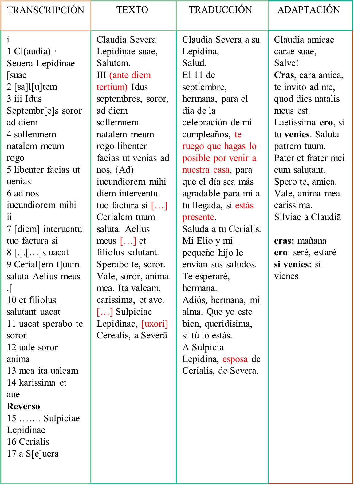 I- Lee la invitación en latín que Claudia Severa envía a su amiga Lepidina, así como la adaptación que se ha hecho de ella. Si lo necesitas, lee la traducción. Después, responde a las preguntas.